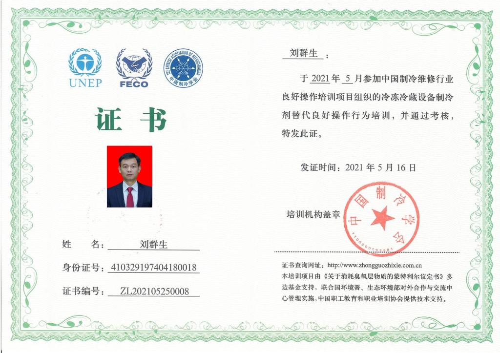 2021年5月14-16日,联合国环境规划署项目——“冷冻冷藏设备制冷剂替代和良好操作行为培训”在江苏省南通市举行。本次培训会由联合国环境规划署、中国生态环境部对外合作与交流中心、中国制冷学会共同主办,江苏省制冷学会承办。河南省制冷学会副秘书长刘群生、太阳集团tyc234cc青年教师吴彦生代表河南省制冷学会参加了培训。