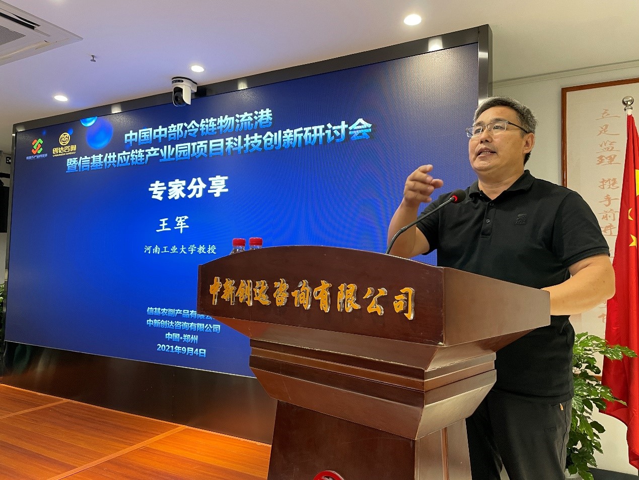 2021年9月4日下午,中国中部冷链物流港暨信基供应链产业园项目科技创新研讨会在郑州市高新区召开,新乡市平原城乡一体化示范区管委会副主任高芳春、中国食品土畜进出口商会冷链流通专业委员会执行理事长江波,河南省肉类协会会长刘承信,信基公司董事长李喜庆以及国内多名行业专家、学者、企业家出席会议。河南省制冷学会作为本次会议的指导单位,贾丰良副理事长、刘群生副秘书长、王军理事参加了会议。
