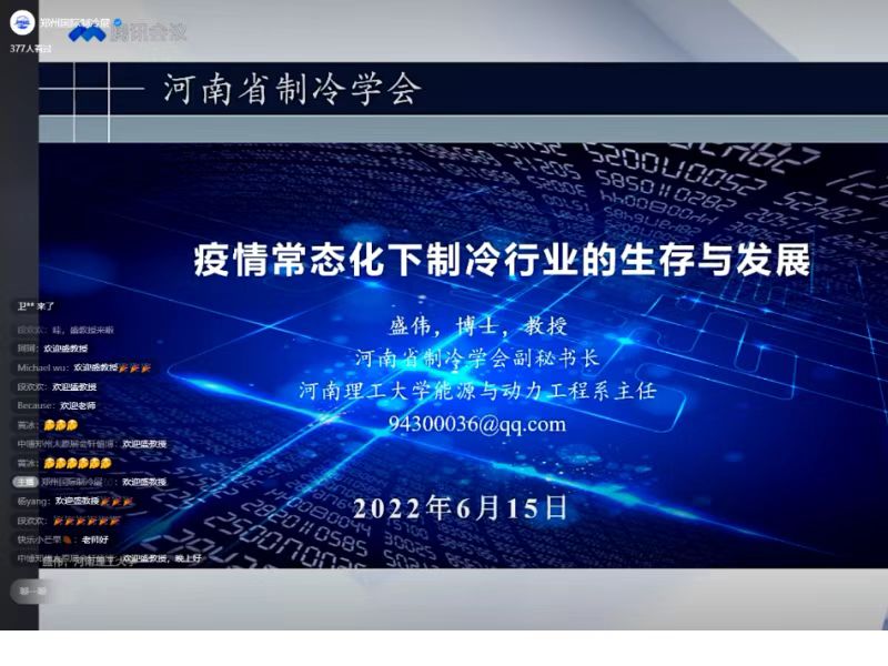 2022年6月15日晚,由河南省制冷学会、郑州国际制冷展组委会联合举办的“百会链千企”系列讲座——《制冷行业如何在疫情常态化下求生存谋发展》顺利开播。学会特别邀请河南理工大学能源与动力工程系主任、河南省制冷学会副秘书长盛伟教授线上开讲,学会秘书长隋继学教授主持直播会。本次直播会有1400多人在线观看。
