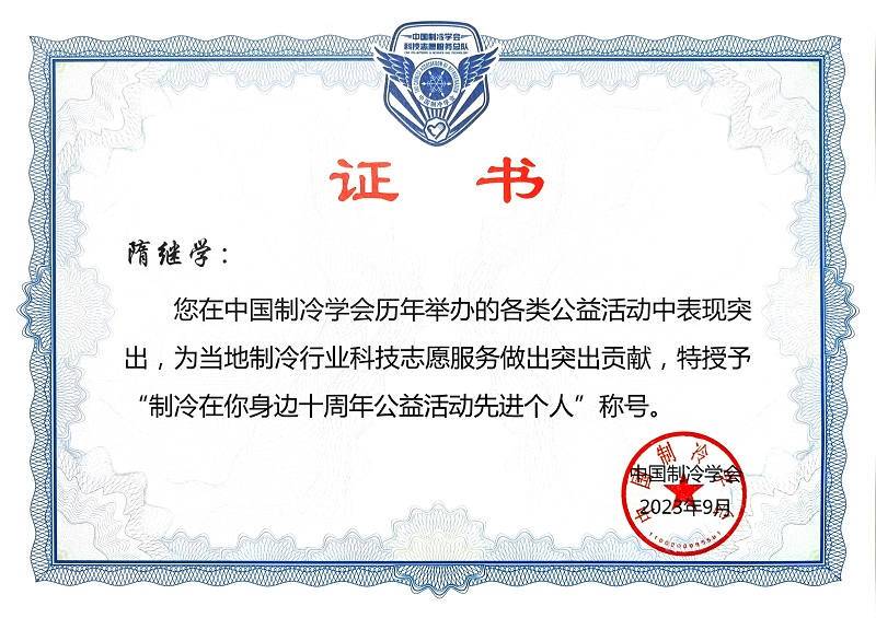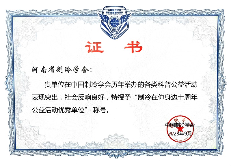 2023年9月8日,在湖北省武汉市举行的“中国制冷学会科技志愿服务总队成立大会暨颁奖仪式”上,河南省制冷学会获“制冷在你身边十周年公益活动优秀单位”荣誉称号,隋继学秘书长获“制冷在你身边十周年公益活动先进个人”荣誉称号。