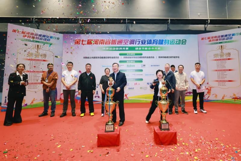 第七届河南省暖通空调行业体育健身运动会于9月21日在郑州市奥体中心举行。运动会继续弘扬““健康运动你我共享,绿色节能合作共赢”主题,突出“健康、节能、交流、融合”特色。河南省制冷学会理事长、河南省土木建筑学会副理事长、河南城建学院党委书记范晓伟,河南省土木建筑学会副理事长兼秘书长王爱菊,中国制冷学会空调热泵专委会副主任委员、暖通空调产业技术创新联盟副理事长河南省制冷学会副理事长李红霞,河南省制冷学会副理事长、河南省土木建筑学会暖通空调专委会主任委员、郑州市暖通空调节能学会理事长王华强,河南省制冷学会空调热泵专委会主任委员、河南省土木建筑学会热能动力专委会主任委员王其庆莅临会议现场出席大会。王华强致开幕词,范晓伟、王爱菊为比赛开球。中国建筑学会暖通分会理事长、暖通空调产业技术创新联盟理事长、中国建筑太阳集团院首席科学家、全国工程勘察设计大师徐伟参与了乒乓球友谊赛。