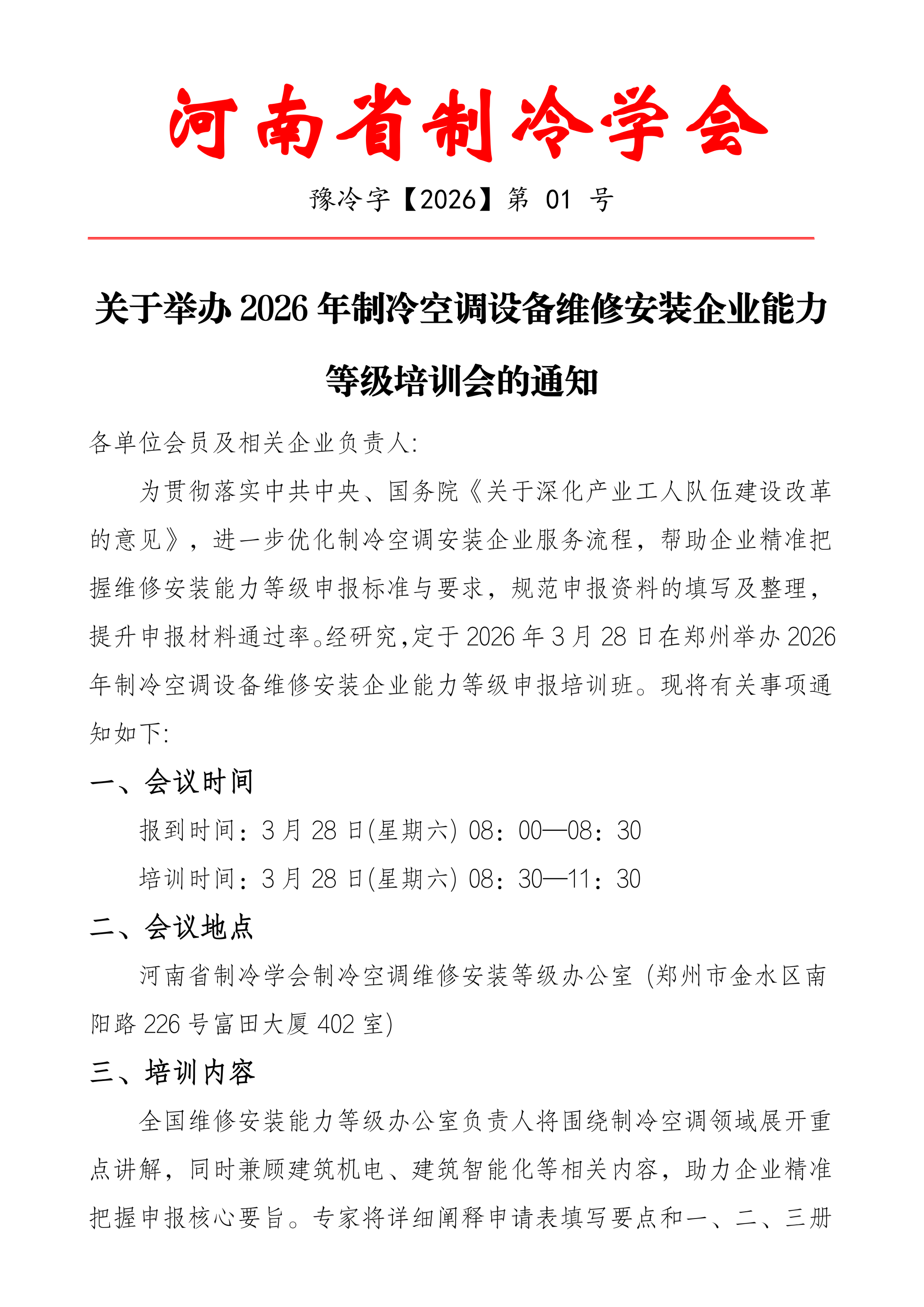 关于举办2026年制冷空调设备维修安装企业能力等级培训会的通知