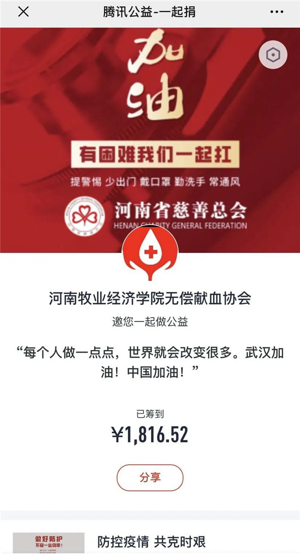 协会于2月15日面向无偿献血协会的全体志愿者们发出了抗击疫情线上捐款活动的倡议,得到学生的积极响应。隔离病毒,不能隔离爱。截至2月25日,向河南省慈善总会的“防控疫情、共克时艰”的专项基金捐款1816元,参与捐赠人数达115人,疫情面前,协会积极行动,捐款数额虽然不大,却承载着浓浓爱意与温情,大家纷纷表示希望聚沙成塔,尽绵薄之力为防控疫情做贡献,为疫情救治奉献自己的力量。