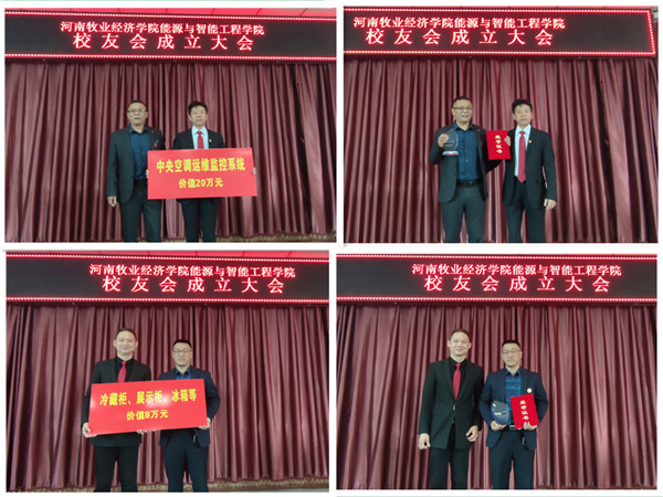 最后,由99届制冷专业毕业生,郑州科瑞空调有限公司总经理吴超杰,代表优秀校友发言,并为母校捐赠价值20万元的中央空调运维监控系统;99届制冷专业毕业生,郑州思念食品有限公司邓九为母校捐赠价值8万元的冷藏柜、展示柜、冰箱等。名誉会长隋继学、会长周凯分别为他们颁发了捐赠证书和纪念杯。