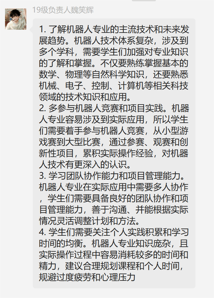 机器人工程专业注重锻炼学生动手能力,在校学生热爱课外学术科技竞赛,在实践中检验自身知识水平。研究生报考率57.1%,通过率21.56%。机器人工程专业学生参加学科竞赛、科技竞赛4年来共获奖78项,获得中国机器人大赛奖项18项,其中国家三等奖9项,省级一等奖2项,省级三等奖7项,全国大学生数学建模竞赛9项,国家一等奖2项,国家级三等奖1项,省级一等奖1项,"互联网+"大学生创新创业大赛16项,“挑战杯”创业计划竞赛省级获奖15项。