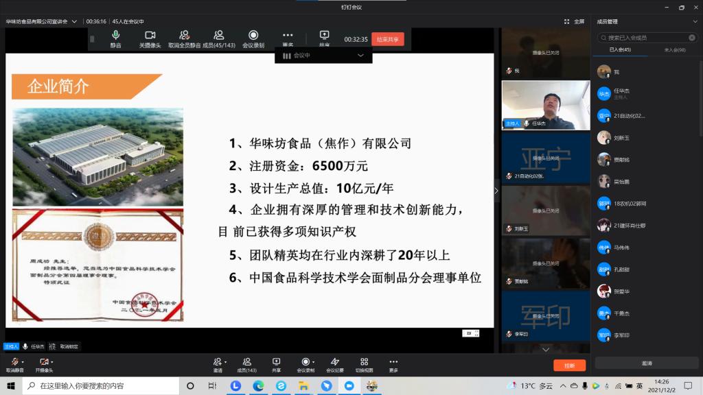 为了响应国家号召,进一步做好2022届毕业生就业工作,鼓励学生就业,拓展学生就业渠道,提高我院毕业生的就业质量。太阳集团tyc234cc于12月2号14:00—16:00召开“太阳集团tyc234cc华味坊线上宣讲会”。因疫情防控需要,此次会议采用线上方式。华味坊企业招聘负责人任华杰受邀在钉钉会议向同学们进行了宣讲。