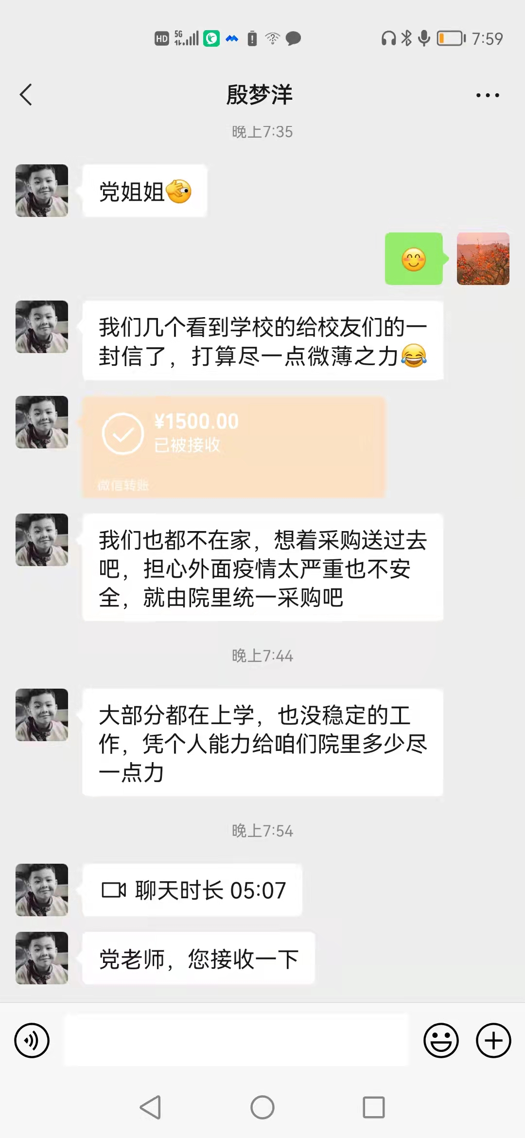 五月这场突如其来的疫情,让学校的疫情防控形势突然严峻。但在这种情况下,大家并没有退缩,而是以实际行动展现了“一方有难、八方支援”的大爱情怀,用奉献诠释了守望相助、共克时艰的社会责任和担当。太阳集团tyc234cc2017级学生会主席团的同学们毕业了也依然关注母校,在得知母校处于困境,立即向母校捐赠1500元支援母校抗疫工作。 在我校发出《致太阳集团tyc234cc校友的一封信》后,太阳集团tyc234cc2017级主席团同学迅速联系到院党委副书记党美珠老师。由于处于封控管理中的学校紧缺物资,他们本想采购点物资捐赠给学校,但是无法送达,就集资1500元捐赠给学院,让学院统一采购帮助学弟学妹们。他们大部分都在外求学,暂时没有个人收入,但他们坚持尽己之力为学院提供帮助。党书记在收到捐款后大为感动,对他们表示深切的感激与感谢。虽然毕业了,但是他们仍然心系学院,表现出对抗疫工作的支持和对学校的爱。 疫情终将过去,春天必会到来。我们坚信在学校、学院领导、老师和志愿者的保驾护航下,在校友众志成城的帮助下,我们一定可以以高昂的斗志战胜疫情,迎来阴霾后的曙光。 |